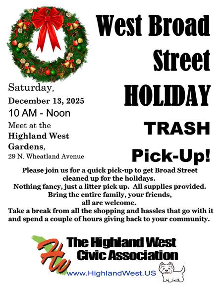 Broad Street HOLIDAY TRASH PICKUP, Saturday, December 13, 2025, 10:00 AM - Noon. Meet at the Highland West Community Garden, 29 N Wheatland Avenue. There is plenty of parking on the street and in the parking lot behind the Westside Community Health Center which is across the street. All supplies provided, just bring yourself, a friend or the entire family. All are welcome!